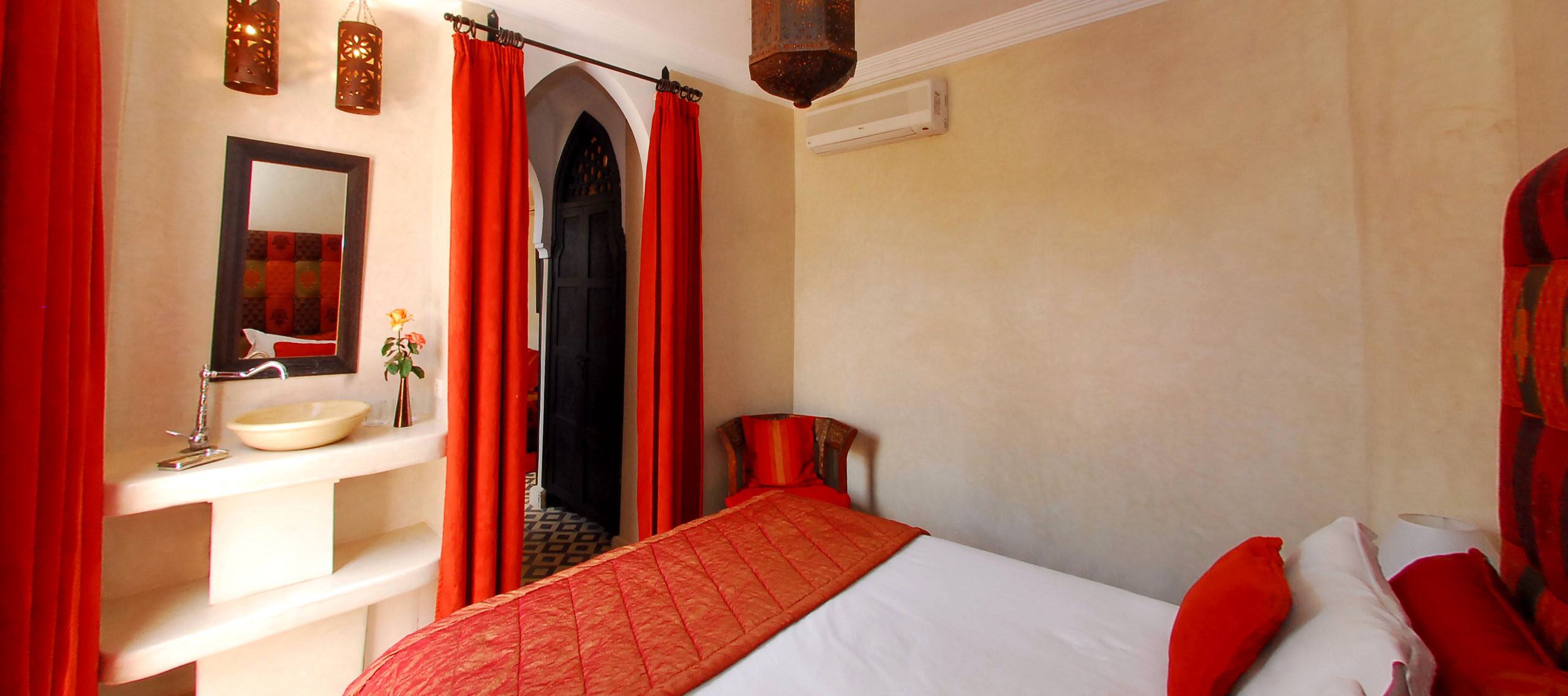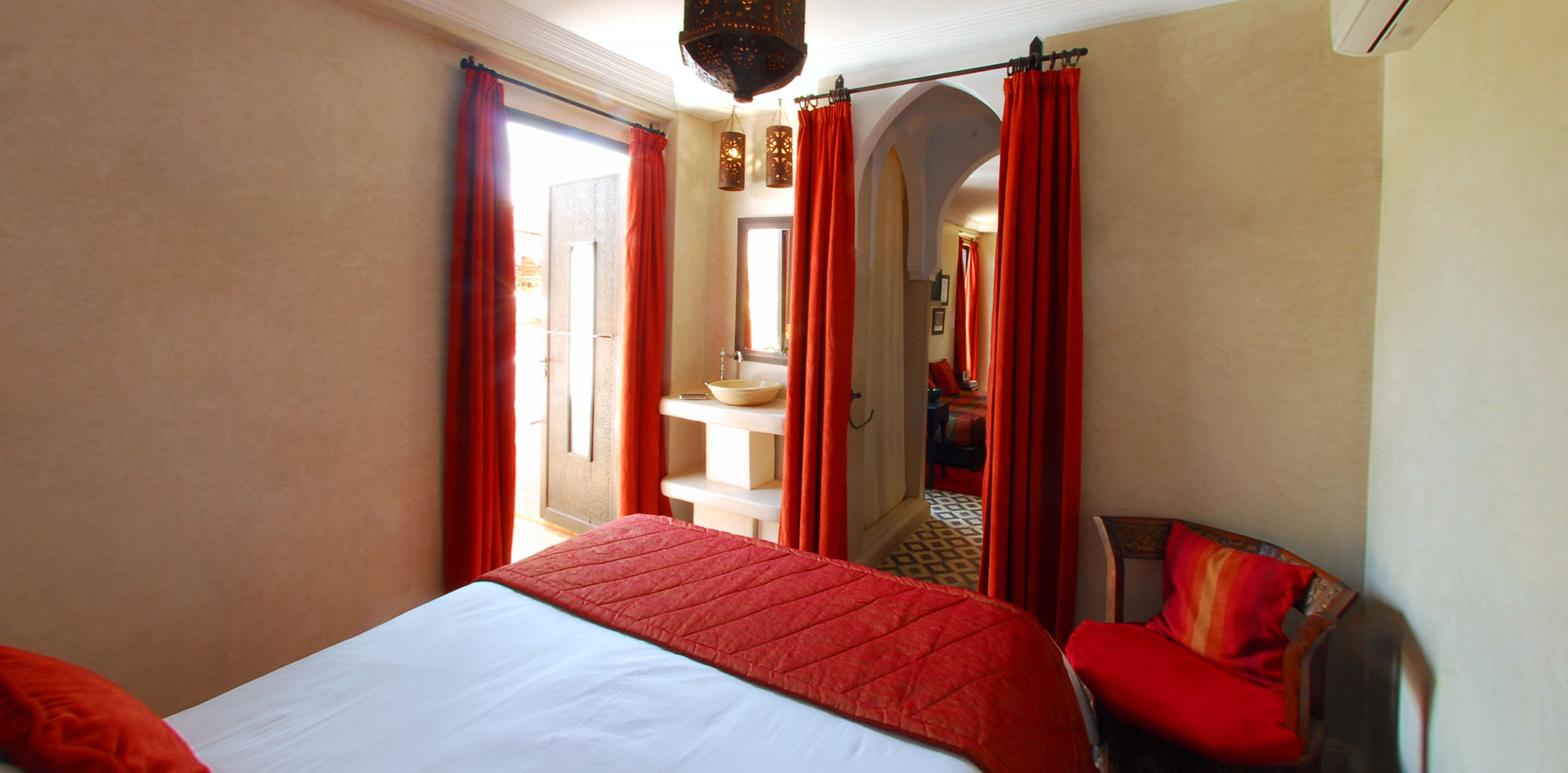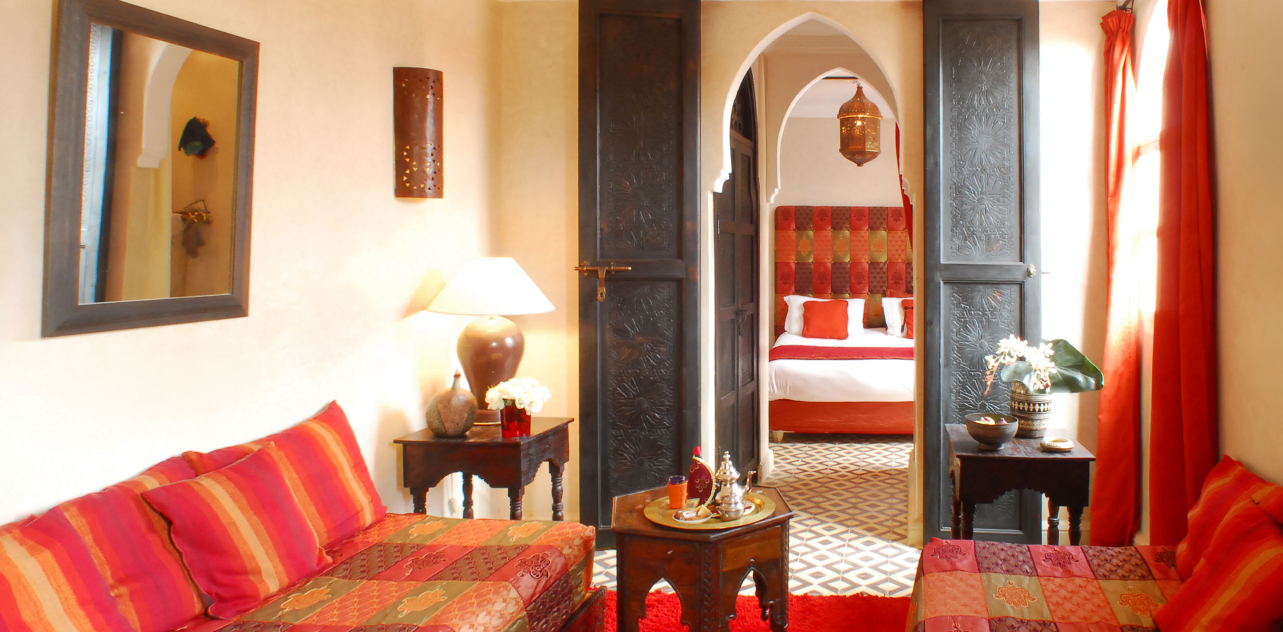 La suite Halaoua (la Douceur), est situĂ©e sur la terrasse du Riad, la chambre Ă  coucher est indĂ©pendante du salon. Cette chambre possède 2 canapĂ©s et est  idĂ©ale pour une famille de 4 personnes.